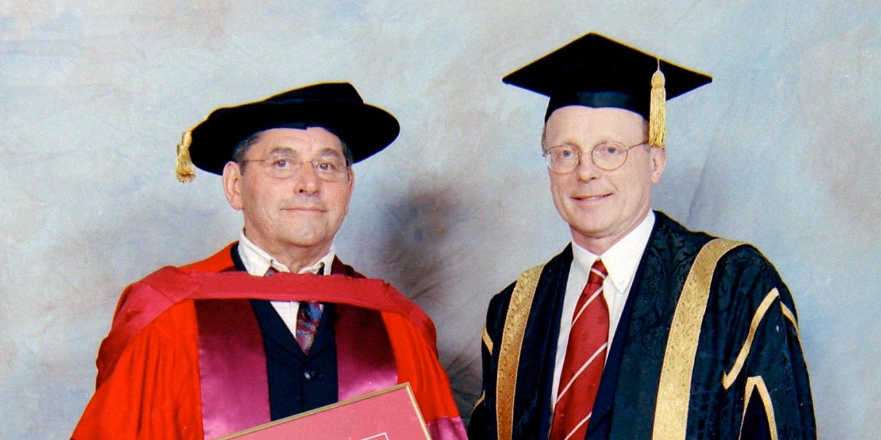 Dr. Elliott Leyton with former Memorial University president Dr. Axel Meisen after being named professor emeritus in 2004. Photo from Memorial University Archives.