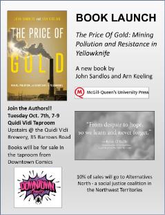 Join John Sandlos and Arn Keeling to celebrate the publication of their new book, The Price of Gold: Mining, Pollution and Resistance in Yellowknife. Newly published with McGill-Queen's University Press. The book tells the troubled tale of Giant Mine, which polluted the air and water around Yellowknife with arsenic trioxide for fifty years, leaving behind 237,000 tonnes of the highly toxic material buried underground. It also recounts the remarkable efforts of the Yellowknives Dene, labour unions, and environmental activists to stop the pollution. Copies of the book will be available for sale at the Quidi Vidi taproom from Downtown Comics, and 10% of sales will go the Alternatives North, a social justice coalition in the Northwest Territories.