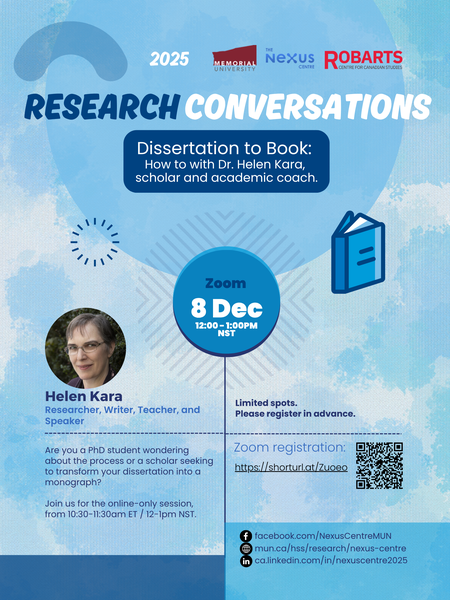 Details: Monday, December 8th from 12-1pm: From Dissertation to Book: A How-to with Helen Kara, academic writing coach, online only.