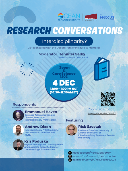 Details: Thursday, Dec. 4th from 12-1pm: A Roundtable with Rick Szostak (Emeritus, U Alberta) on Interdisciplinarity?, co-sponsored by Ocean Frontier Institute, Core Science 1203 and online.