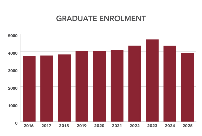 In 2024, the Government of Canada introduced a cap on the number of international student visas it would process. This policy shift has impacted Canada’s reputation as a destination of choice for international learners and has impacted universities nationwide. At Memorial, international graduate student applications, which had been growing steadily since 2018, dipped sharply, from 11,833 in fall 2024 to 5,426 in fall 2025 (a decrease of 54.1 per cent).