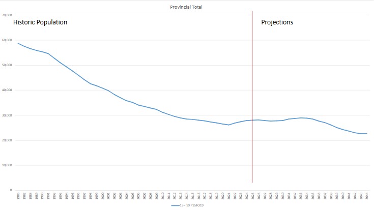 The number of high school (15-19) learners within Newfoundland and Labrador has been steadily decreasing for decades, from 58,754 in 1986 to 26,880 in 2022. Despite this, Memorial increased the number of Newfoundland and Labrador students by 3.3 per cent in fall 2024 (10,897 students) and maintained approximately the same number of NL students in fall 2025 (11,102).