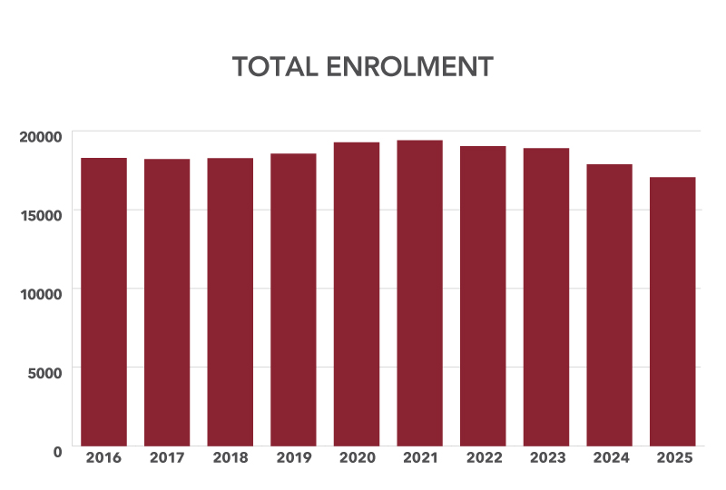 Enrolment in fall 2025 shows a decrease in total enrolment of 4.6 per cent from fall 2024. This decline was anticipated and is aligned with similar trends in Atlantic Canada and across the country.