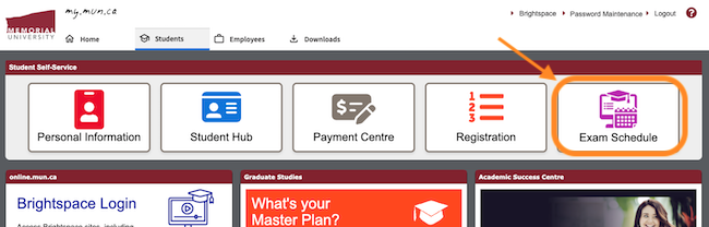 You can find your personalized schedule on Student Self-Service. Access your schedule by clicking on the Exam Schedule button within the Student Self-Service channel on my.mun.ca. It is also available from the left-hand menu of the Student Hub.