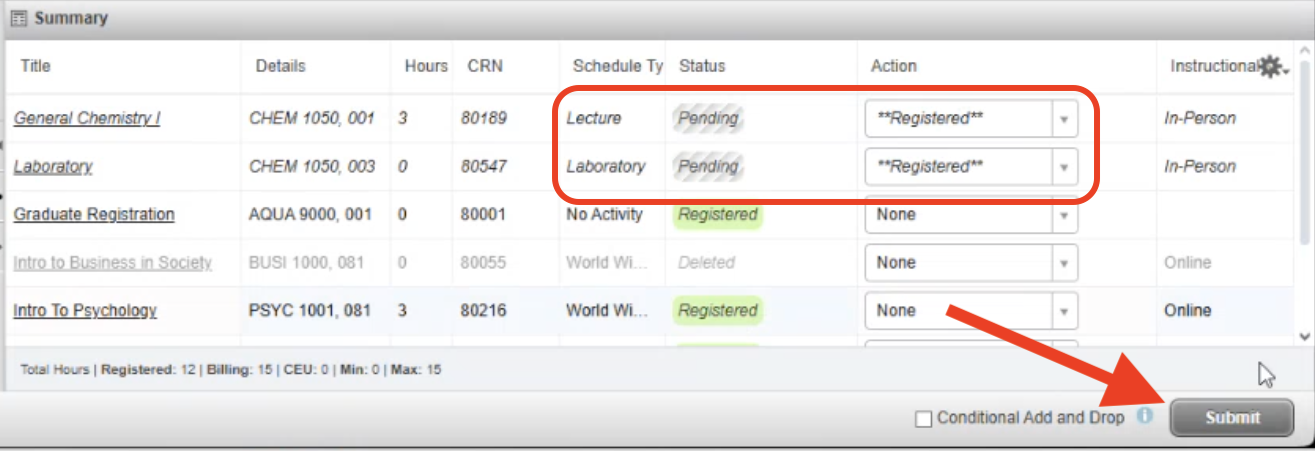 Both the lecture and lab will display in the Summary block as Pending. Click the Submit button to confirm your additions and add the lecture and lab to your schedule.