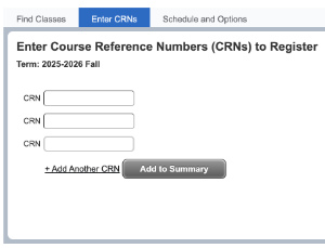 Enter the CRN for the class you want to add. To add multiple CRNs click the +Add Another CRN link.