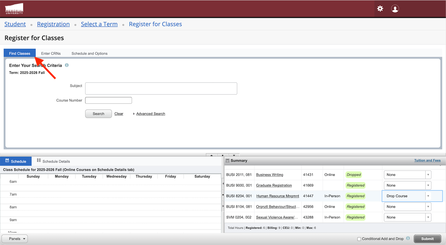 Located next to the Submit button in the Summary block, use the Conditional Add and Drop option when you want to drop a course from your schedule on the condition that you can successfully add a new course to your schedule without any errors. Use this option if you are looking to swap sections or courses and do not want to lose your seat in the currently registered course until you are successfully added to the new course.