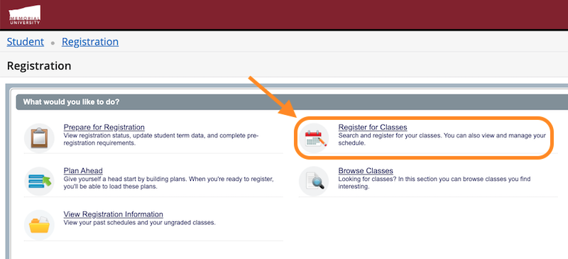 From my.mun.ca/student click the Registration button within the Student Self-Service channel.