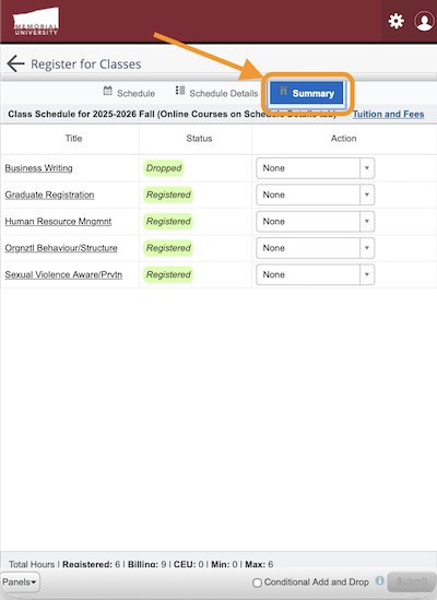 On the Register for Classes screen, look for the Summary block. In a desktop/tablet view you'll find it in the bottom-right. In a mobile view you'll find it as a button near the top. View the appropriate screenshot below for further support.