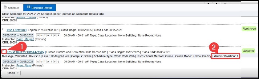 If you are waitlisted for a course, you can now see your position on the waitlist. In the Schedule Details tab, click the arrow (1) to expand the details of a course. Your position on the waitlist will be displayed (2).