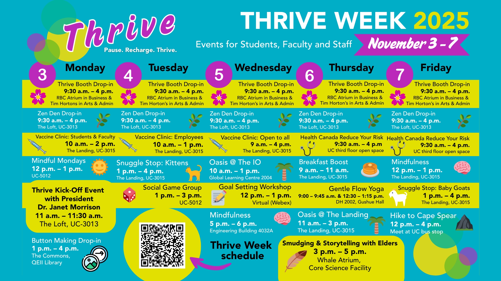 The purpose of Thrive week is to offer both in-person and virtual events that encourage Memorial students, faculty and staff to prioritize self-care, alleviate stress, and discover new skills and resources that support mental health and overall well-being.