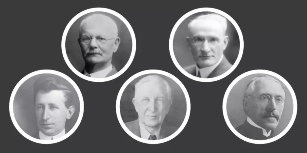The founding trustees of Memorial University College, from left: Ronald Kennedy, William Blackall, Vincent Burke, Arthur Barnes and Levi Curtis. Photographs from Memorial University Archives.