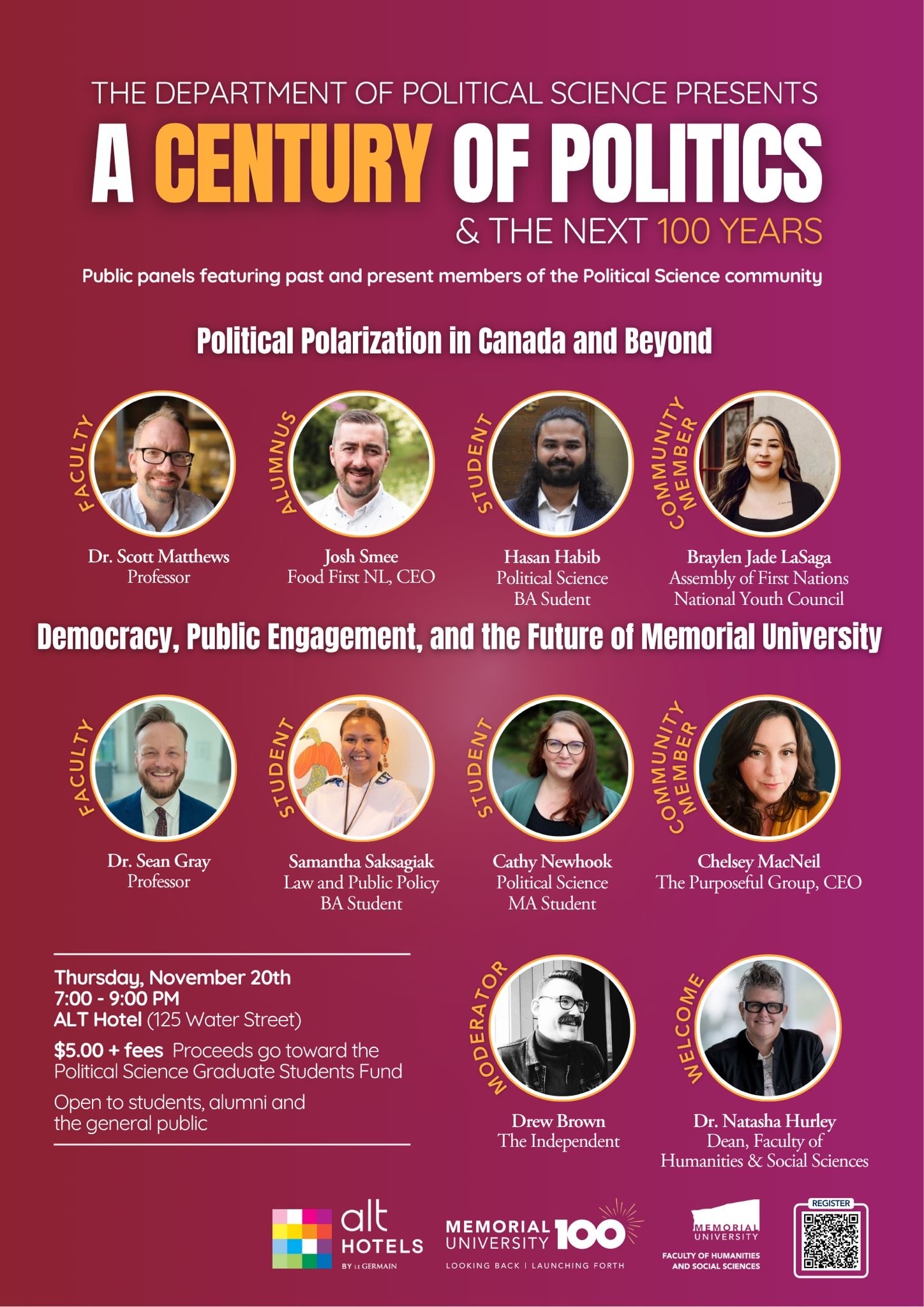 Please join the Department of Political Science, Faculty of Humanities and Social Science, on Nov. 20 at 7pm at the Alt Hotel for the second installment of A Century of Politics and the Next 100 years. Tickets are $6.66 and can be purchase here.