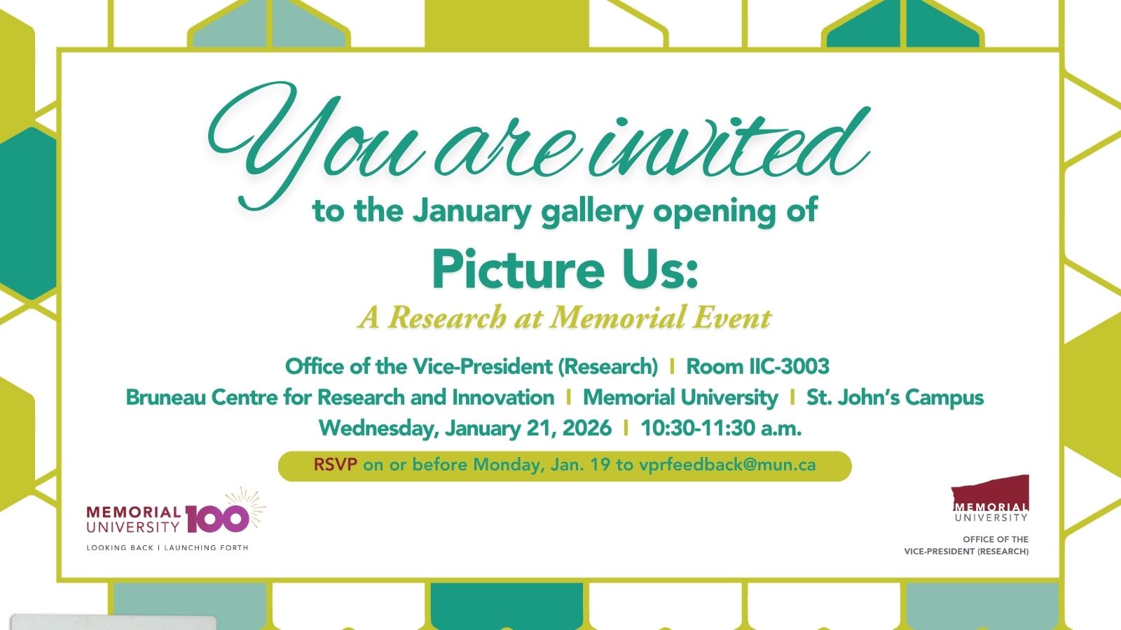 The Office of the Vice-President (Research) invites you to the January 2026 gallery opening of Picture Us: A Research at Memorial Event.