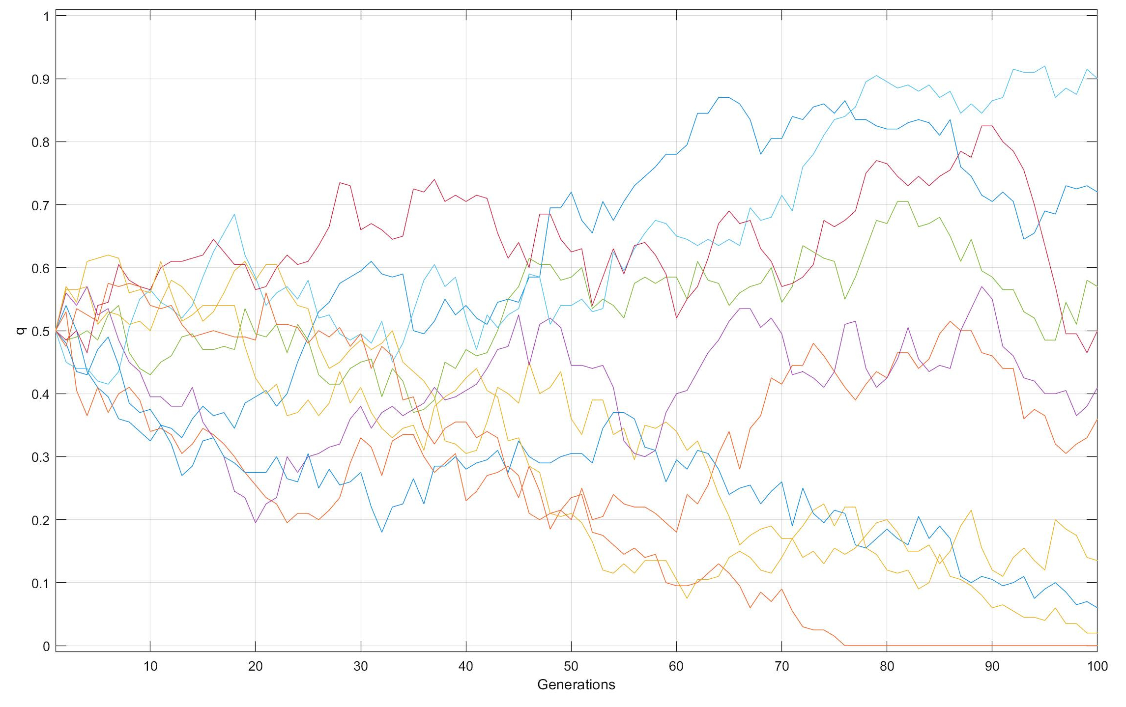 From an initial q = f(B) = 0.50 in each of 10 populations