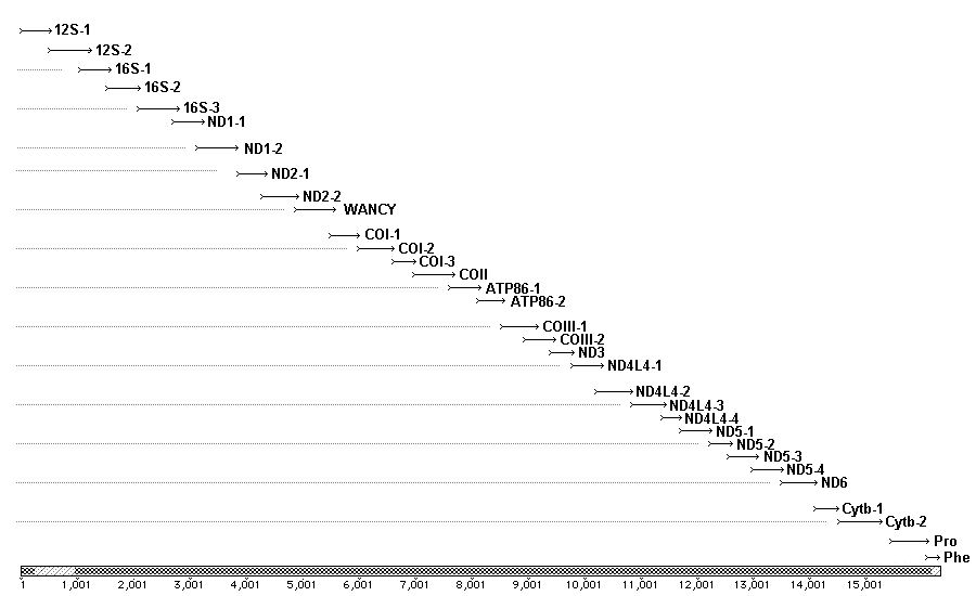 The complete 17Kbp mtDNA genome of the Atlantic Cod (Gadus morhua) has been assembled from a set of 31 overlapping, contiguous PCR products ("contigs"). The individual sequence segments vary from 0.4 ~ 1.0 Kbp in length and overlap by 20 ~ 100 bp.
