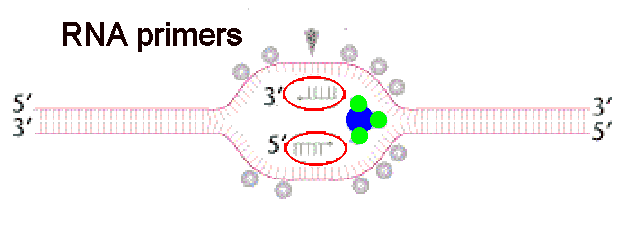 RNA primers are synthesized and attach to both strands of ssDNA in the 5'3' direction