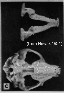 Note the lateral expansion of the zygomatic arch to accommodate enlarged masseter muscles, and reorientation of the tooth rows toward the midline. This arrangement gives greater mechanical strength in chewing bamboo, the only food item in the Panda's diet.