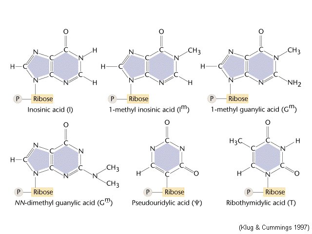 Primary tRNA molecules are transcribed from tDNA genes with the standard four bases. After assembly of mature tRNA molecules, specific bases are covalently modified so as to stabilize the tertiary structure.
