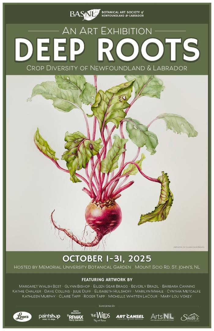 The Botanical Art Society of Newfoundland & Labrador is pleased to present their latest art exhibit Deep Roots: Crop Diversity of Newfoundland & Labrador. This exhibit will run October 1-31, 2025, and we encourage you to come and visit any time during our regular opening hours. There is no charge to visit the exhibit, which is located in our Conference Room. Many of these beautiful artworks are available for purchase. Please check with Visitor Services at the front desk.