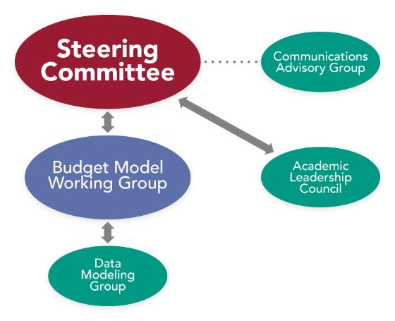 Three groups with representation from across the university are focused in particular areas of the development and implementation process. The groups consult with and report to the Steering Committee, including: