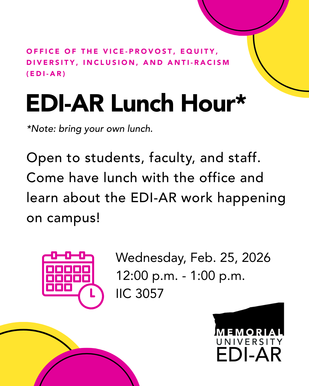 This relaxed, drop-in session provides an opportunity for staff, faculty, and students to learn more about the EDI-AR team and the important work we do. NOTE: Please bring your own lunch.