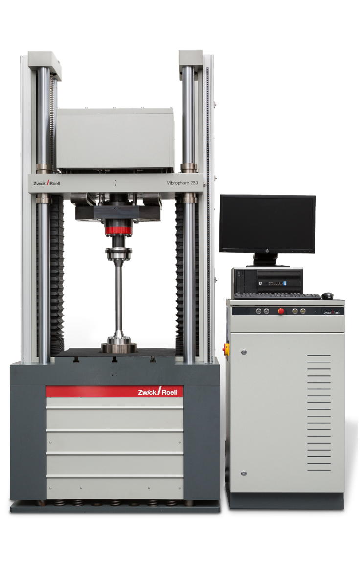 The ZwickRoell Vibrophore 250 is a high-performance resonance testing system designed for determining fatigue strength and durability under both dynamic and quasi-static loading. Operating on an energy-efficient electromagnetic resonance principle, it achieves high testing frequencies—typically ranging from 30 to 300 Hz—allowing for rapid High Cycle Fatigue (HCF) and fracture mechanics testing with a maximum load capacity of 250 kN. This unit is equipped with an integrated temperature chamber, enabling precise material characterization under controlled environmental conditions ranging from -80 °C to +250 °C (depending on the specific chamber model). Controlled via the testXpert software suite, the Vibrophore 250 provides exceptionally high lateral stiffness and load frame coaxiality, making it an essential tool for evaluating metals, composites, and structural components under realistic thermal and mechanical service conditions.