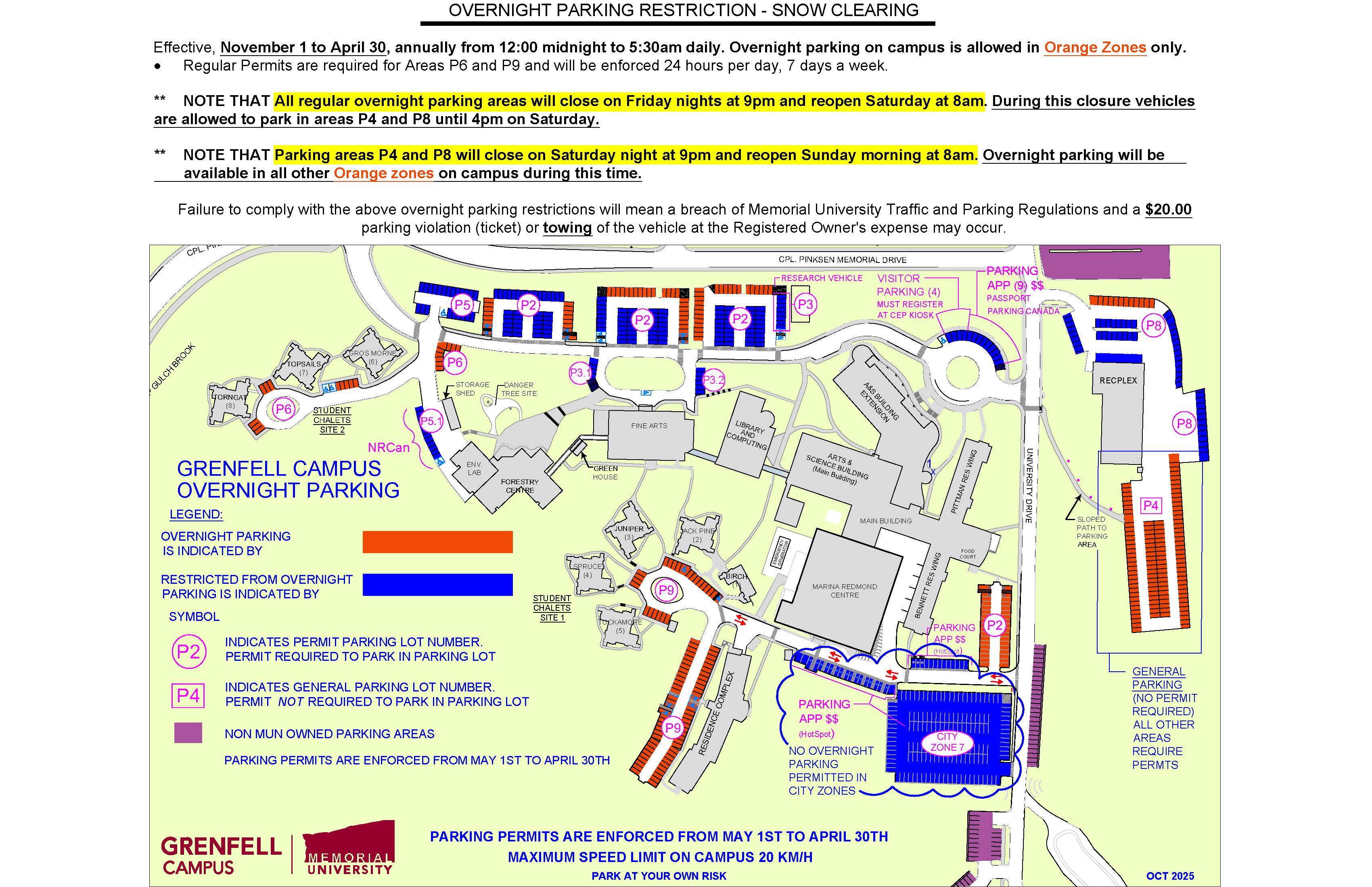 Below you will find parking maps and the permit application for Grenfell Campus. Click the link for a larger, downloadable PDF version.