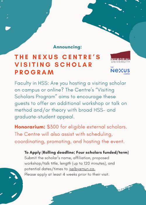 To Apply (Rolling deadline; Four scholars funded/term): Submit the scholar’s name, affiliation, proposed workshop/talk title, length (45-120 minutes), and potential dates/times to jselby@mun.ca. Please apply 4 weeks prior to their visit.