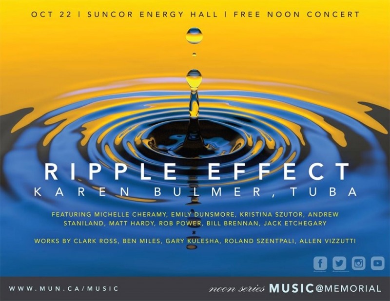 Dr. Karen Bulmer, our low brass applied professor and resident yoga instructor, will be featured in our Music@Noon series on Tuesday, October 22nd. Dr. Bulmer has been preparing a very impressive piece by American composer and trumpetter, Allen Vizzutti, entitled Cascades which was originally written for unaccompanied trumpet. At Ripple Effect, you’ll hear the tuba play notes at mind-bending speeds never heard before within our walls.