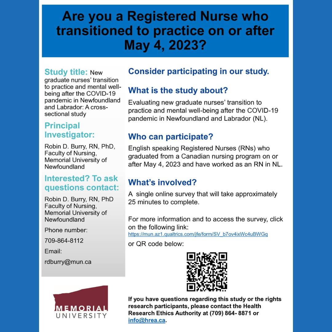 Researchers at Memorial University are conducting a quantitative study examining the transition to practice experiences and mental well-being of registered nurses in Newfoundland and Labrador (NL) after the COVID-19 pandemic was declared over.