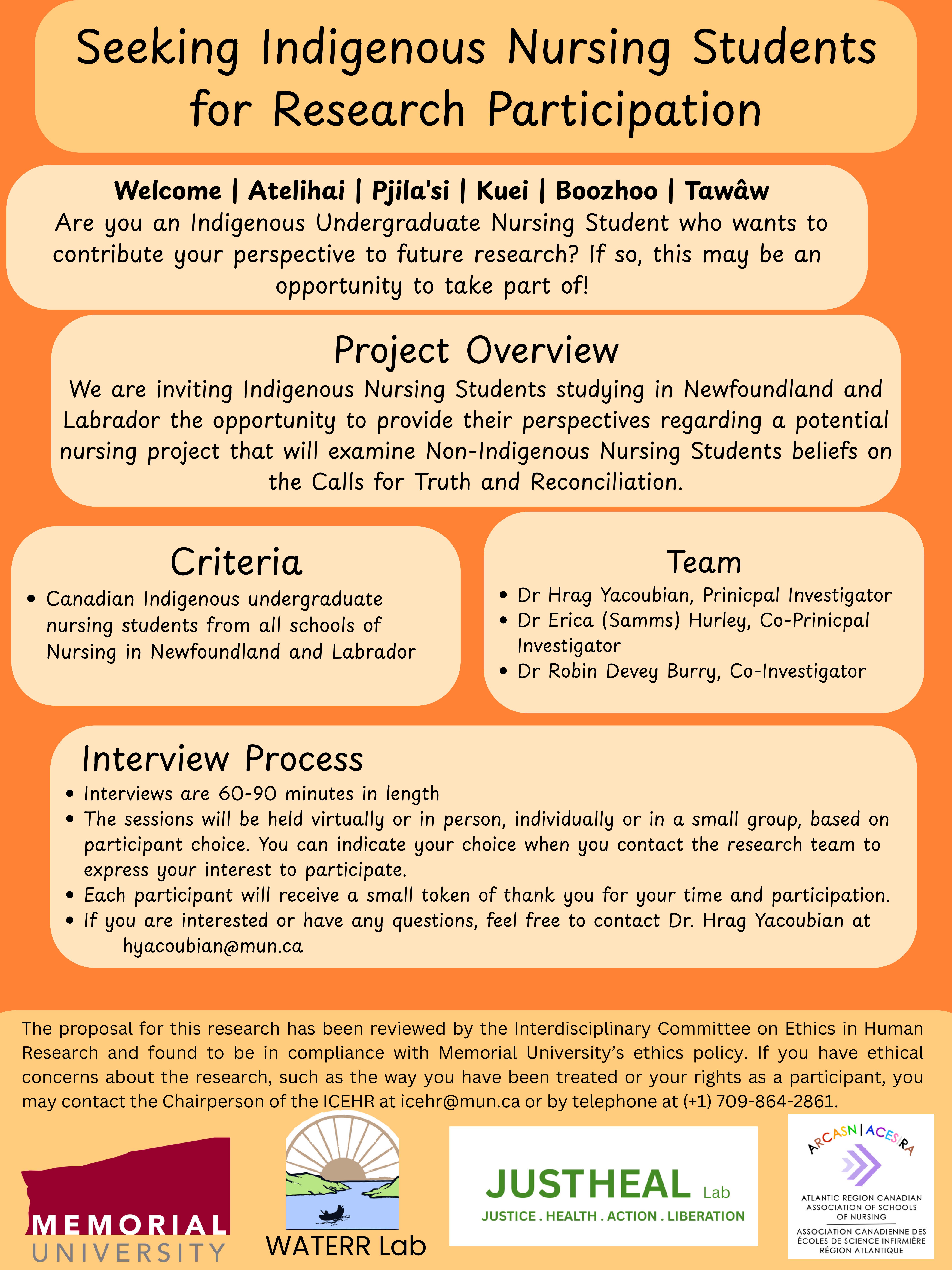 We are inviting Canadian Indigenous undergraduate nursing students (IUNS) from all schools of Nursing in Newfoundland and Labrador to participate in a research study titled: Indigenous Undergraduate Nursing Students’ (IUNS) Perspectives Related to Non-Indigenous Undergraduate Nursing Students’ (Non-IUNS) Relationship with the Truth and Reconciliation Commission Calls to Action (TRC-CA): Giving Voice to Indigenous Students’ Research Priorities.
