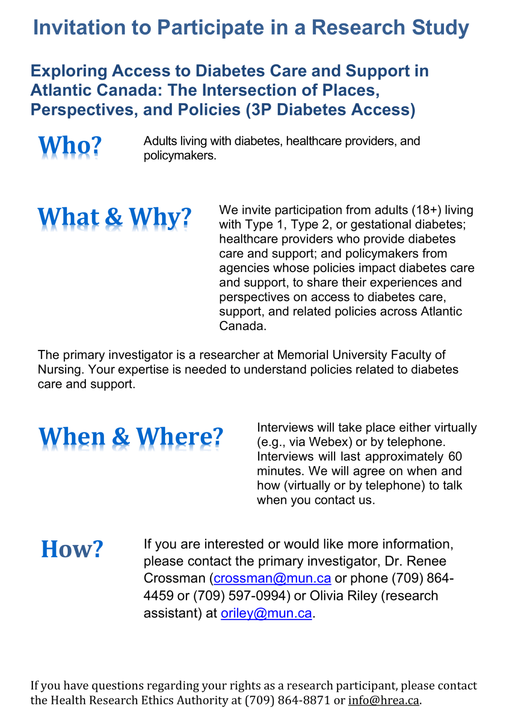 Researchers in the Faculty of Nursing at Memorial University areconducting a study exploring access to diabetes care and support across Atlantic Canada – The Intersection of Places, Perspectives, and Policies (3P Diabetes Access).