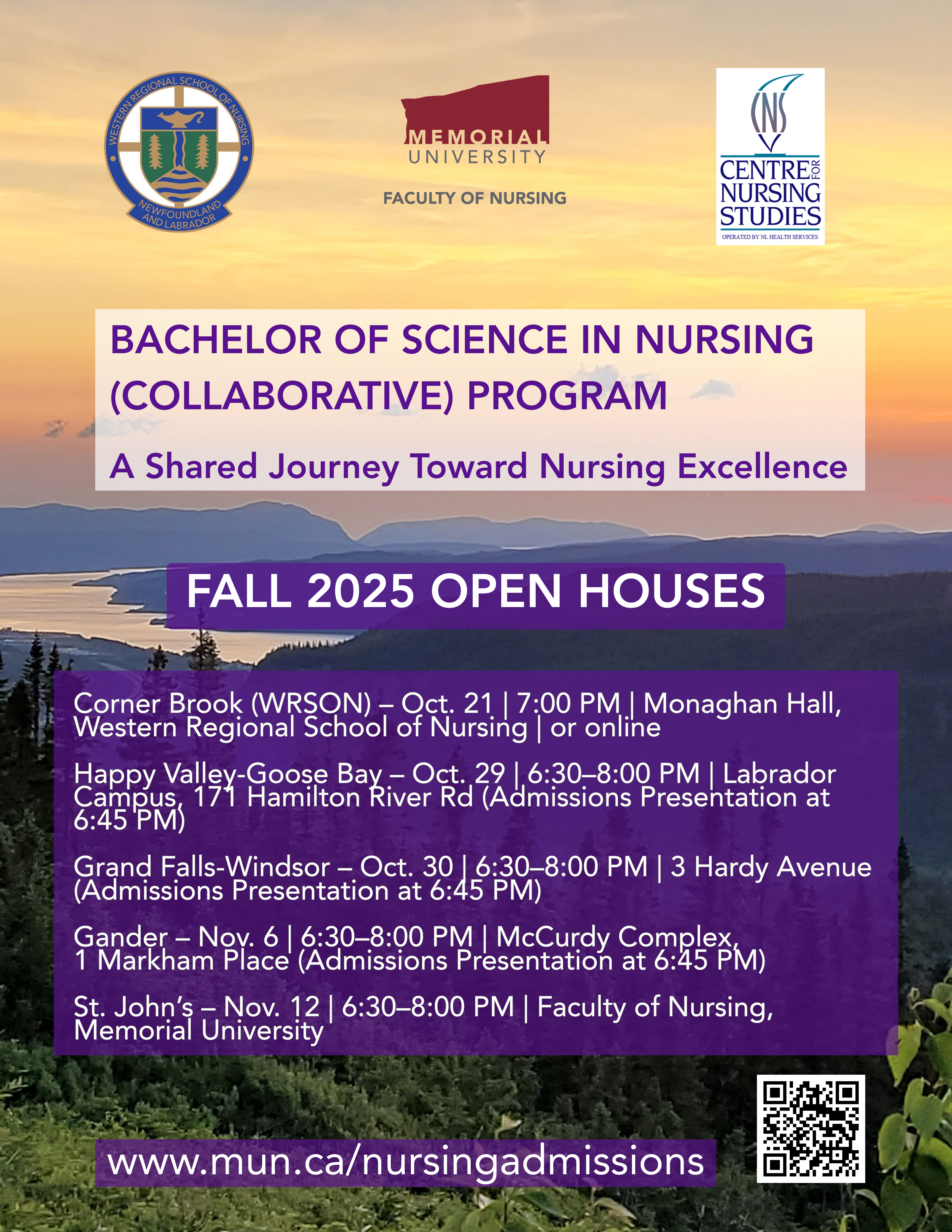 There are several admissions pathways for entry into our BScN (Collaborative) Program. Be sure to review our web pages for High School Applicants, Current Memorial University Students, LPN Bridging Applicants, Other Post-Secondary Students, and International Applicants, as they apply to you.
