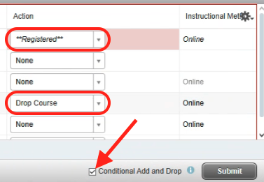 Using the Action dropdowns, make sure one course has **Registered** selected and at least one other course has Drop Course selected. Click the Conditional Add and Drop checkbox and then Submit to process your changes.