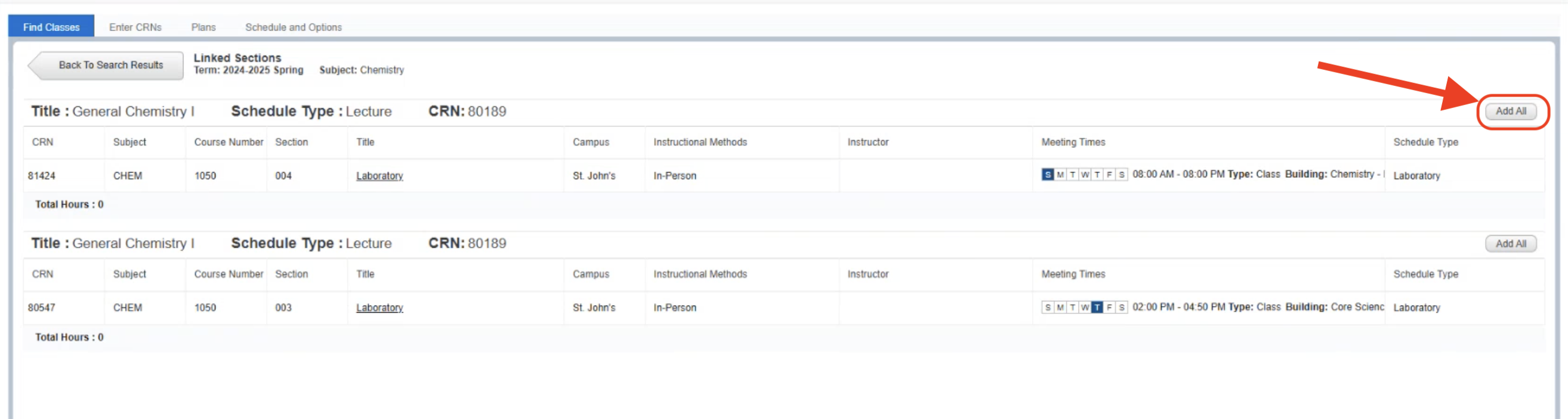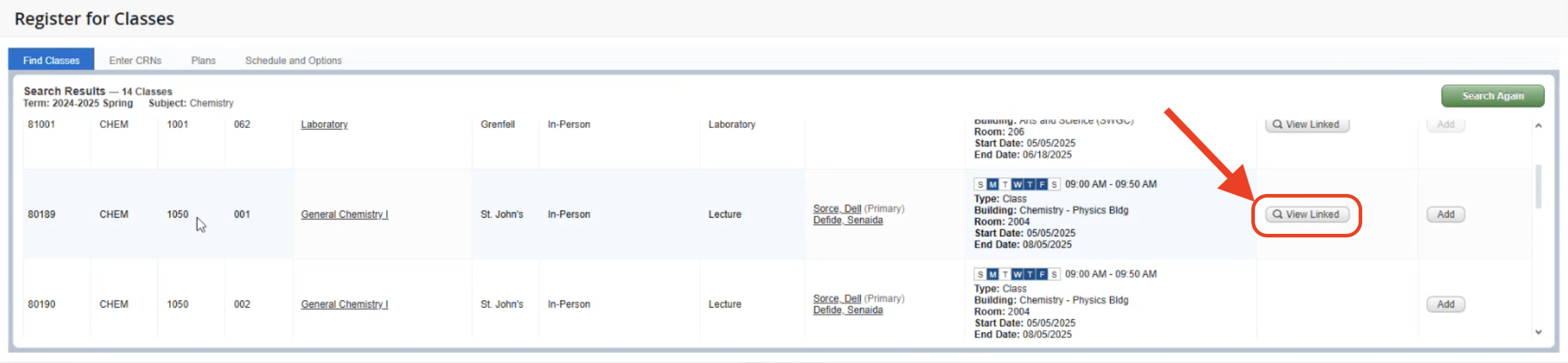For certain courses you must register for both a lecture and lab section at the same time. If you try to register for only one of the linked courses, you will receive an error notifying that you must register for all linked sections at once. To view and add linked classes: