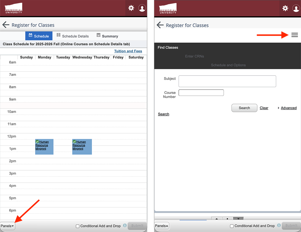 To view the Search for Classes block on a mobile device, click the Panels button in the bottom left, then click the Hamburger menu (three horizontal stacked lines) to display the Find Classes, Enter CRNs and Schedule and Options tabs.