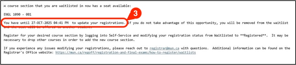 In the updated Student Self-Service, if a waitlisted seat becomes available you will receive an email to your @mun.ca address telling you there is a seat available. You will have ~36 hours from the notification email date/time to accept your seat in the course. The email will display the deadline date and time (3) for you to accept the seat.