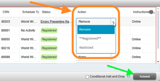 In the Action dropdown, you can either remove the course from your worksheet or you can change your status to Waitlisted. Once you've made your decision, click the Submit button to confirm your changes.