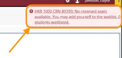 If you attempt to register for a course for which you don't meet the reserves or if the course is full, you will receive an error message in the top-right corner. If available, you will also have the option to join the waitlist under the Action dropdown.