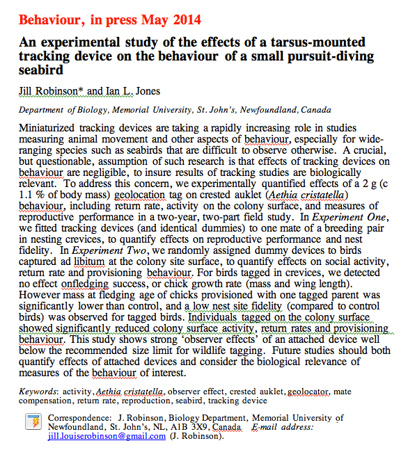 Robinson, J. and I.L. Jones. 2014. An experimental study of the effects of a tarsus-mounted tracking device on the behaviour of a small pursuit-diving seabird. Behaviour 151 (12-13): 1799-1826. DOI:10.1163/1568539X-00003217 (abstract)