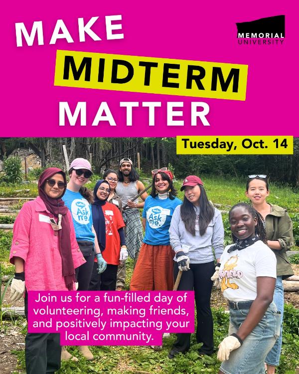 Join us on Tuesday, Oct. 14, 2025, starting at 9 a.m. at The Landing (third floor of the University Centre, UC-3015) for a fun-filled day of volunteering, making friends, and positively impacting your local community. Volunteer organizations include Hillcrest Estates, Johnson Geo Centre, Rainbow Riders, the Gathering Place, and the Memorial University Botanical Garden.