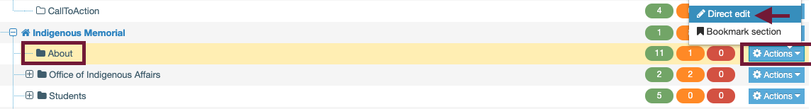 To enter direct edit mode, click the blue actions box across from the page you want to edit, and choose "Direct edit."