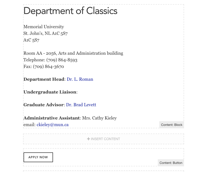 Every block in direct edit will display its content type in the button right corner. In this example, let's pretend we're looking to edit or delete the "apply now" button on our page.