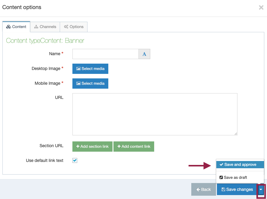 If you are a moderator, you can click the arrow by the save changes button to reveal the save and approve shortcut. Changes will not appear on your site until the content has been approved. Allow a few minutes for the changes to appear live on your site. If you are a contributor, click save an wait for a moderator to approve the changes.