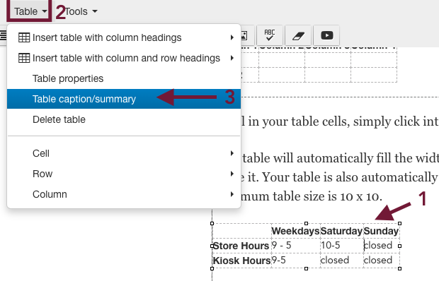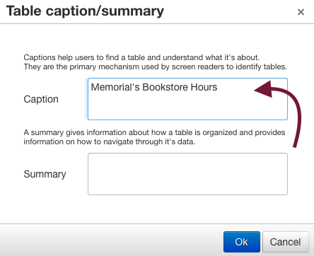 In order for your table to be read properly by a screenreader to a non-sighted reader, you must use a table caption. To do so: