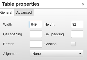 These fields allow you to set the width and height of your table (in px) as well as adjust your cell spacing, padding, and border sizes.