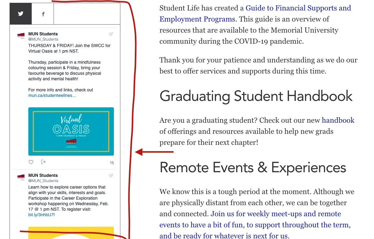Contact Web Content Services and request that a social media widget be added to your page. Be sure to include a link to the page you want the widget added to, as well as a URL of the Facebook and/or Twitter and/or Instagram pages you want your social media widget linked to.